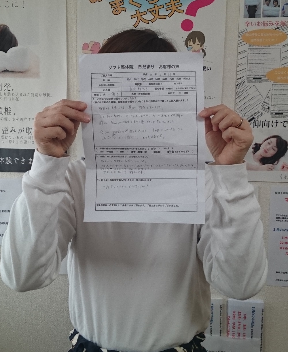 腰や首が痛くても、へんな治療でよけいに悪くなったらどうしようと思う方もいらっしゃると思いますが、「ソフト整体院日だまり」は全然痛くないので安心です。ゆがみがとれると、こんなに体が軽く感じるんだ!とびっくりしました。