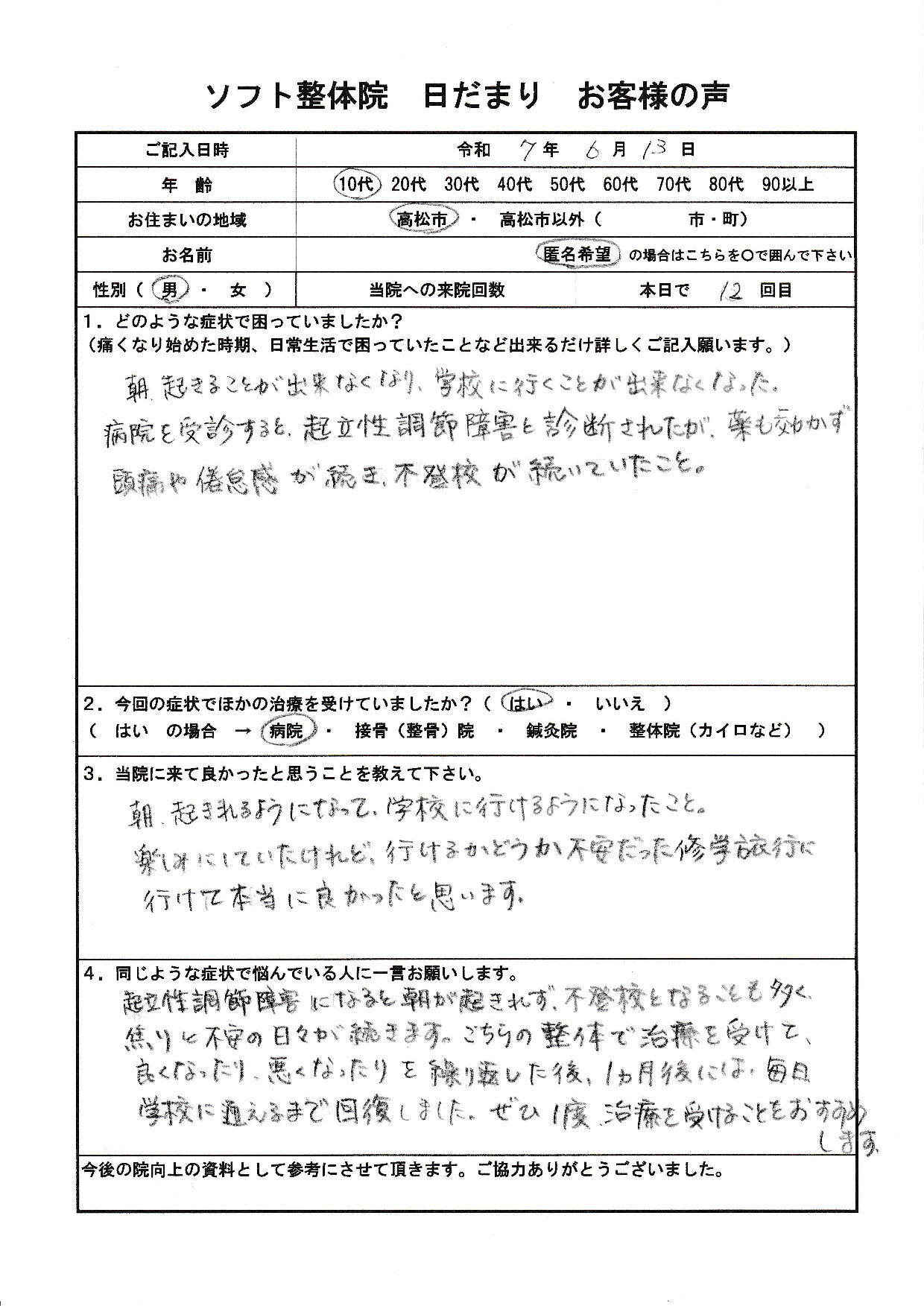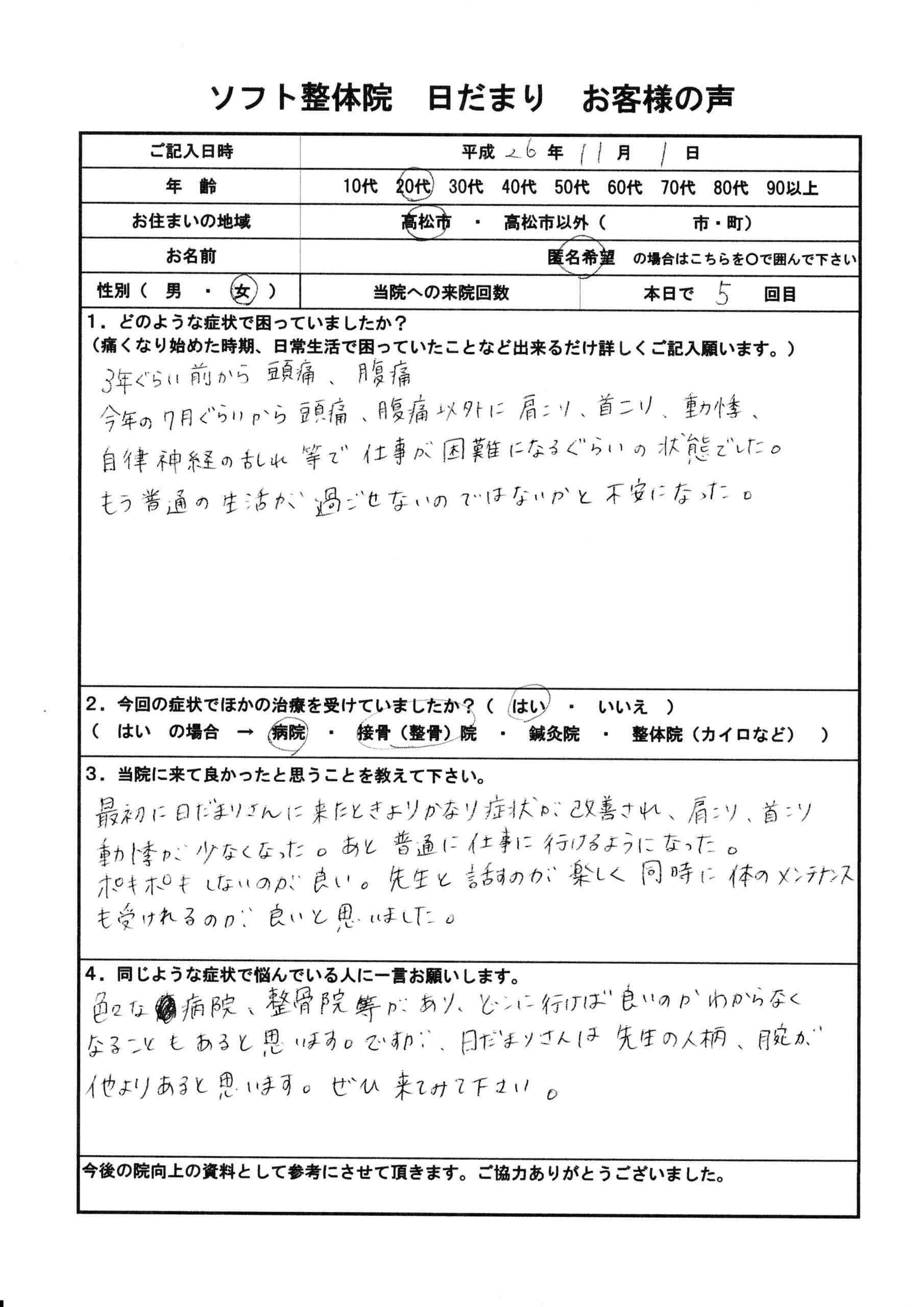 自律神経の症状はすぐに治るのは難しいです。通い続ける度に症状が緩和していきました。私に様な症状でお悩みの方は、一度先生の施術を受けてみられてはいかかでしょうか。