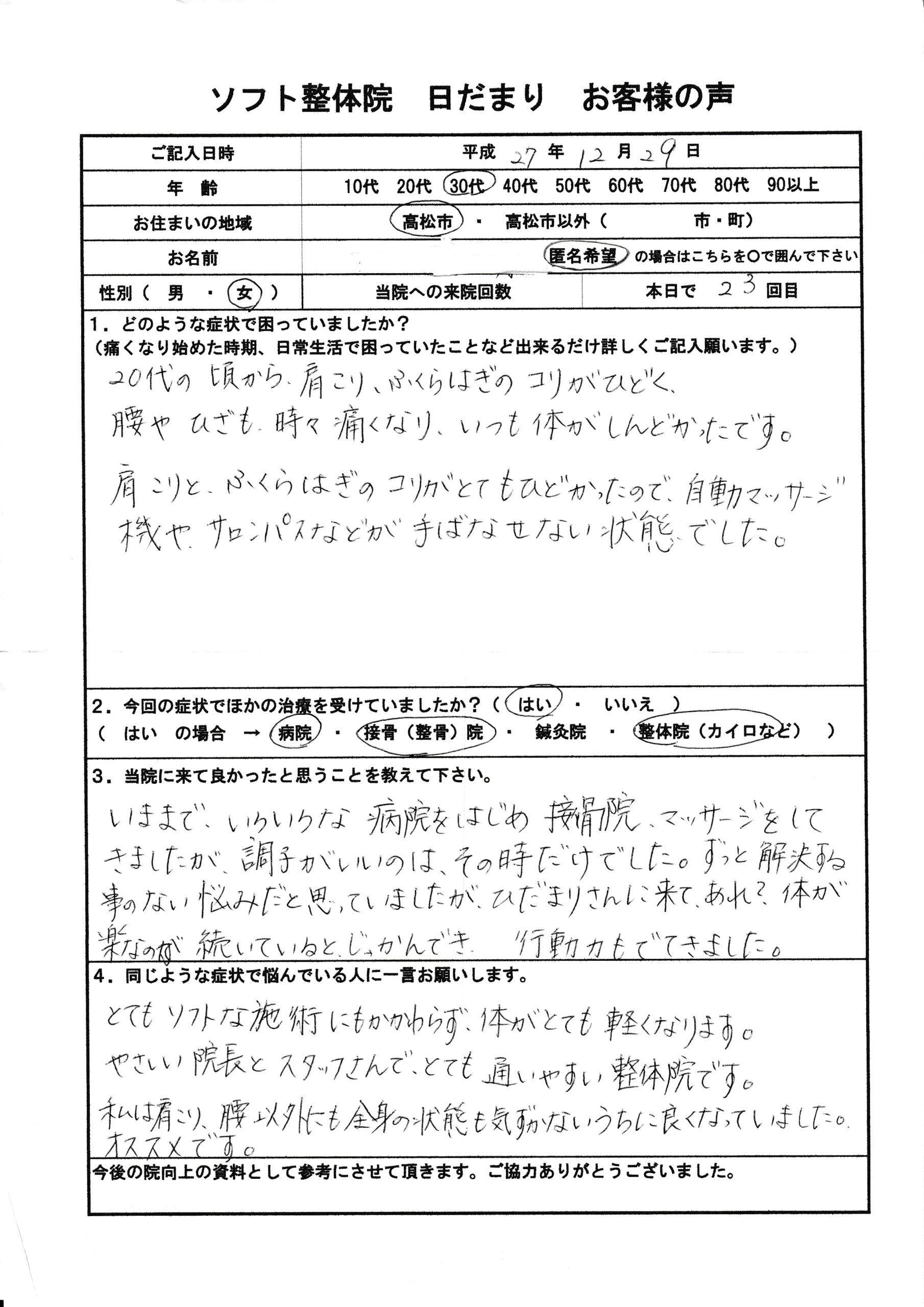 今まで色々な所へ行ってみましたが、あまり効果が実感できなかったり、値段が高すぎると効果があっても続けれなかったりで、半信半疑でしたが、日だまりさんは、今まで行った中で全然違いました。最初にお話を聞いて下さり、とても納得でき、その時に信頼できる先生に出会えたと嬉しく思いました。施術も実際に受けて、回数を重ねるごとに肩こり、首こり、腰痛が良くなり、ふわふわめまいもなくなりました。姿勢もよくなりウエストも少し変化あり、とても良いことばかりです。
