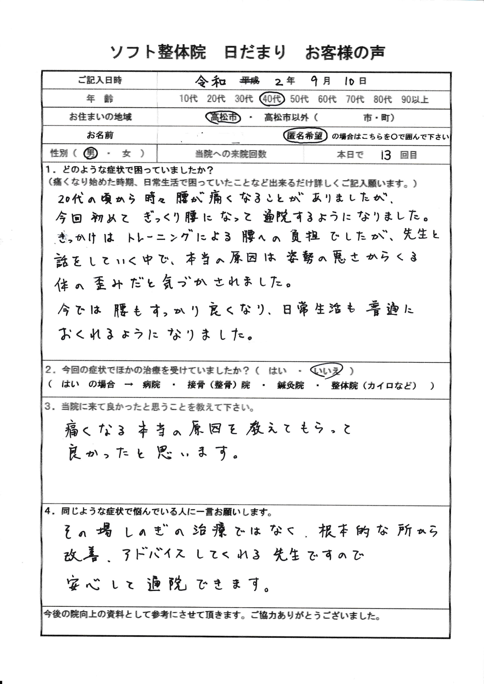 20代の頃から時々腰が痛くなることがありましたが、今回初めてぎっくり腰になって通院するようになりました。きっかけはトレーニングによる腰への負担でしたが、先生と話をしていく中で、本当の原因は姿勢の悪さからくる体の歪みだと気づかされました。今では腰もすっかり良くなり、日常生活も普通におくれるようになりました。