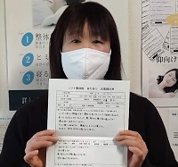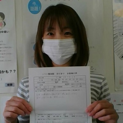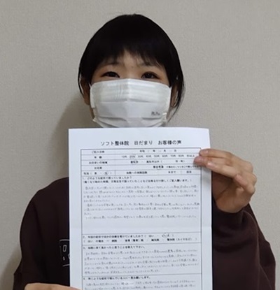 少しずつ腰痛と肩こりが楽になっていき、体が改善されている変化を感じることができて、本当に嬉しかったです。また、生活の中で無意識にしていた悪い姿勢を正すことが大事であることを教えてもらえてよかったです。