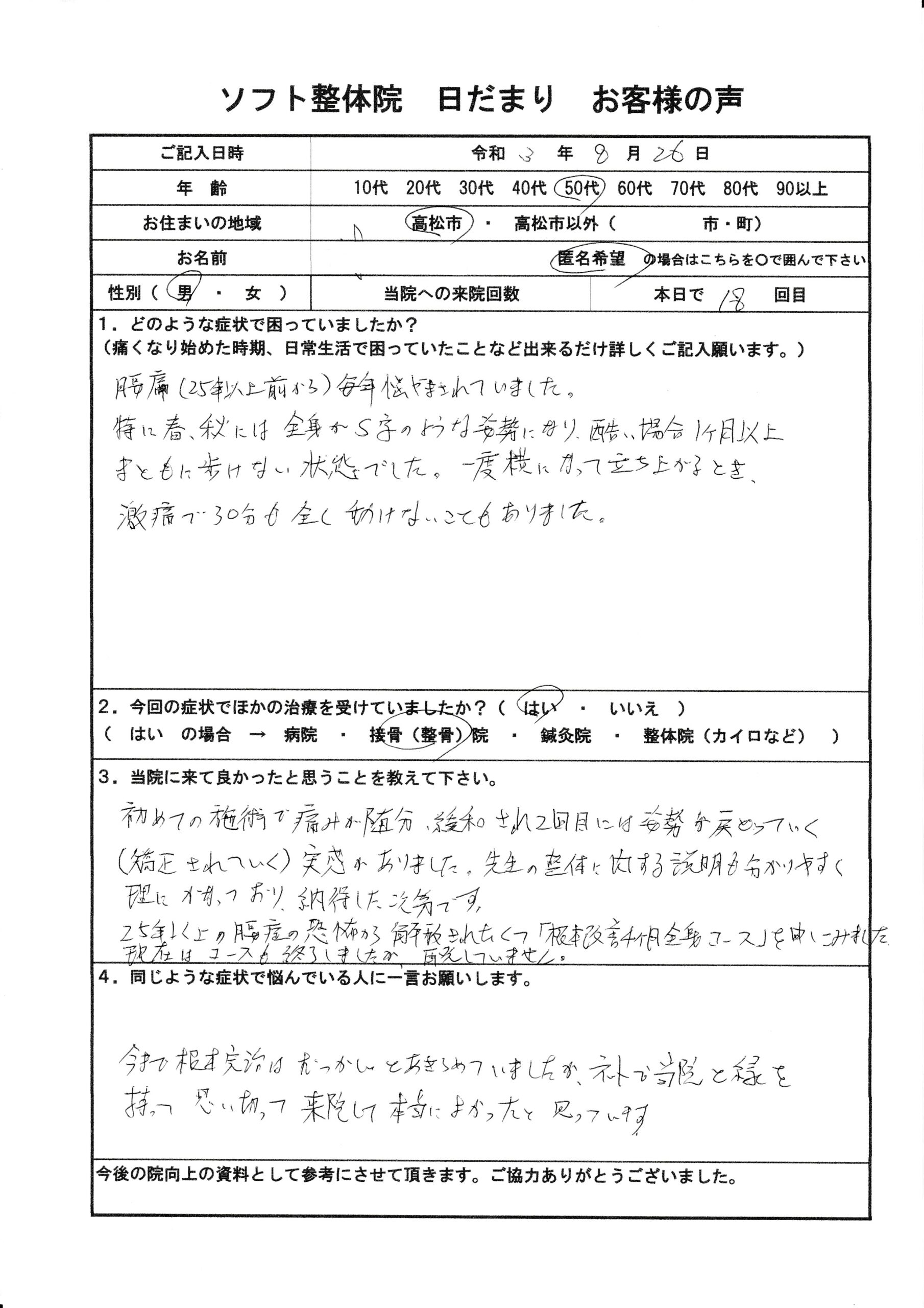 今まで根本完治はむつかしいとあきらめていましたが、ネットで当院と縁を持って思い切って来院して本当によかったと思います。