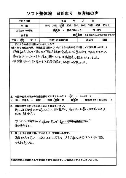 痛みが出た当初は、整形外来に行きレントゲンをとってもらい、シップだけの処置だけでなかなか痛みがおさまらなかったのですが、こちらにきて2~3回の施術で痛みがおさまり、今ではほとんど痛みが出なくなりました。ただ体をゆらしてもらうだけで体が軽くなり、体の歪みや姿勢、歩き方のまちがいに気がつかせてもらいました。