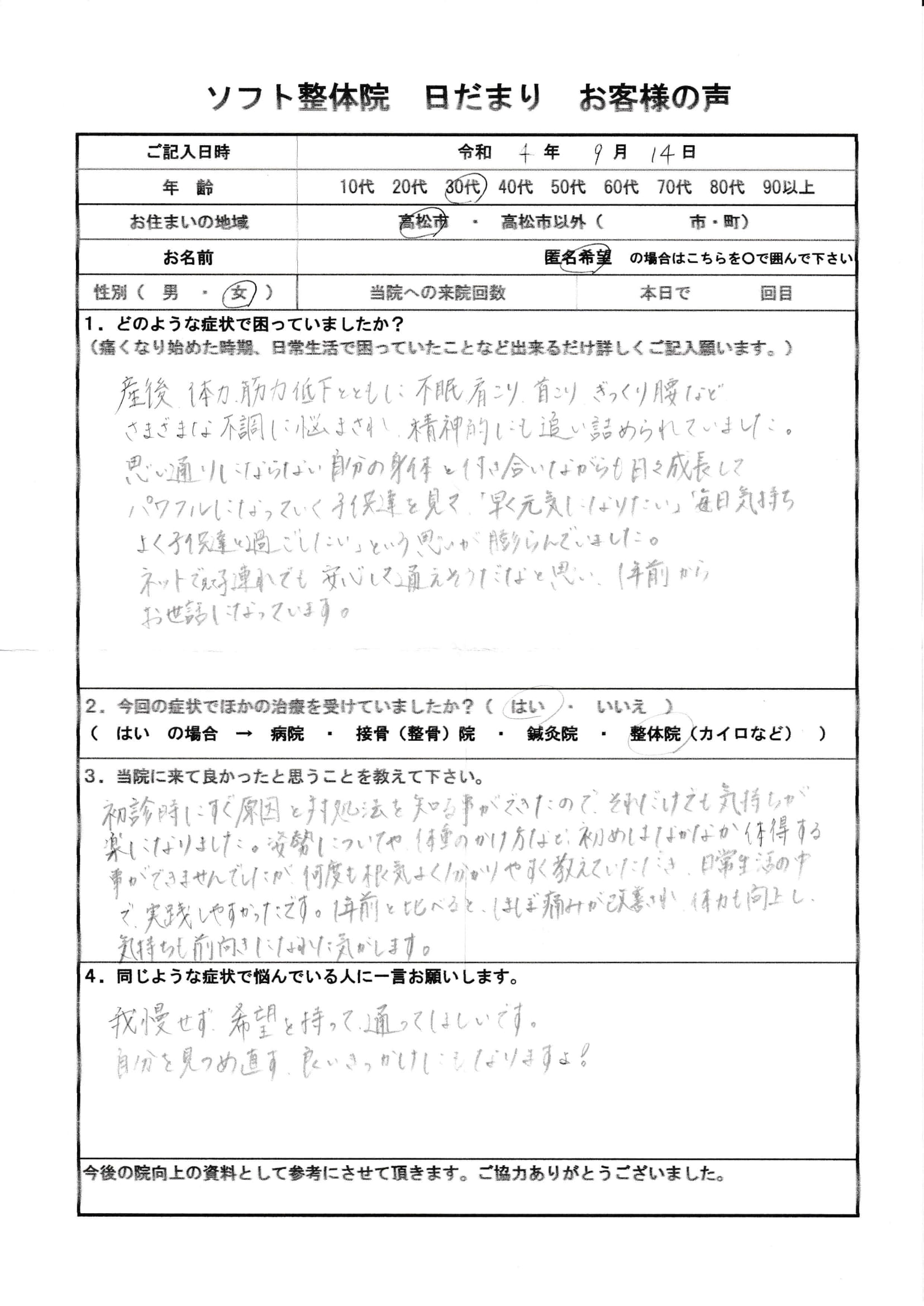 元々肩こりで腰痛持ち。出産をしてから慣れない育児を行うことで症状がひどくなりました。授乳を頻回に行うため背中は丸くなり抱っこすることも多いため肩こりも悪化。中腰での動作も多く腰痛も悪化。ゆっくり休むこともできないため、出産から3カ月後にはどんどん体は疲れていき、体はガチガチの状態で頭痛も出現、イライラすることも多く体の疲れがピークになりました。どうにか背中の張り、肩こり、腰痛をしたいと思い、ネットで検索して、「日だまり」を見つけてその日にtelして、治療を受けました。
