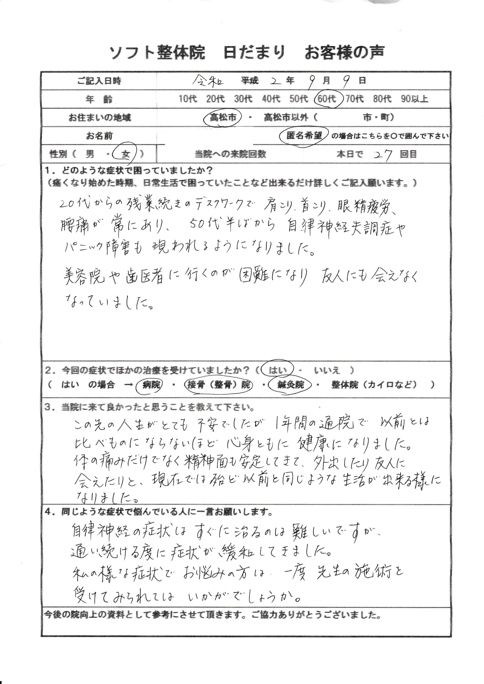 20代からの残業続きのデスクワークで、肩こり、首こり、眼精疲労、腰痛が常にあり、50代半ばから、自律神経失調症やパニック障害も現れるようになりました。美容院や歯医者に行くのが困難になり友人にも会えなくなっていました。
