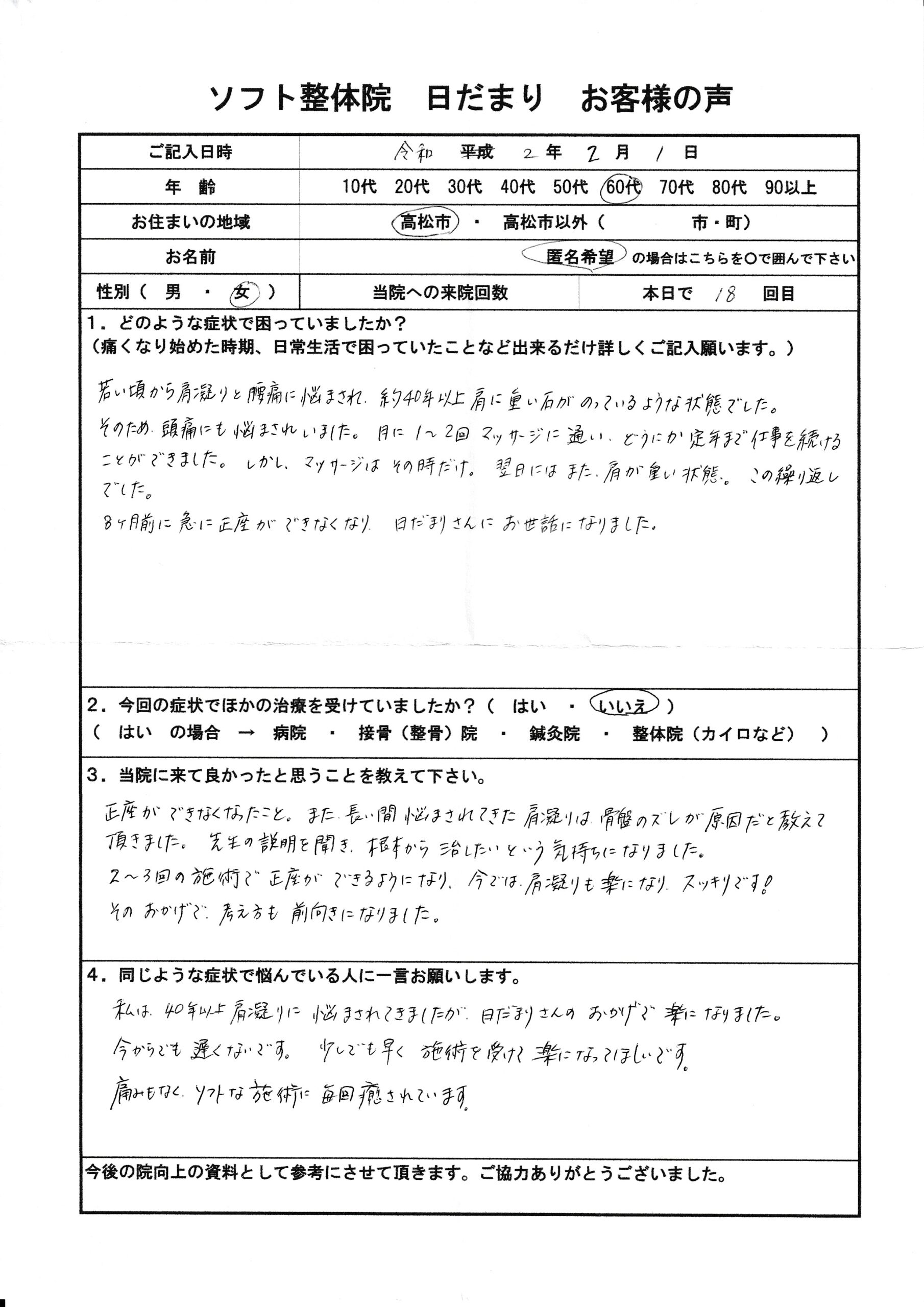若い頃から肩凝りと頭痛に悩まされ、約40年以上肩に重い石がのってるような状態でした。そのため、頭痛にも悩まされていました。月に1~2回マッサージに通い、どうにか定年まで仕事を続けることができました。しかし、マッサージはその時だけ。翌日にはまた、肩が重い状態。この繰り返しでした。8ヶ月前に急に正座ができなくなり、日だまりさんにお世話になりました。