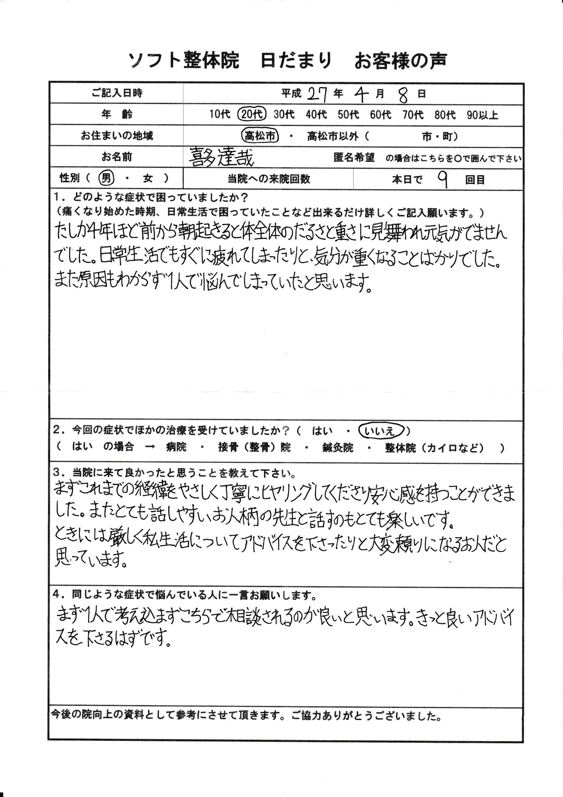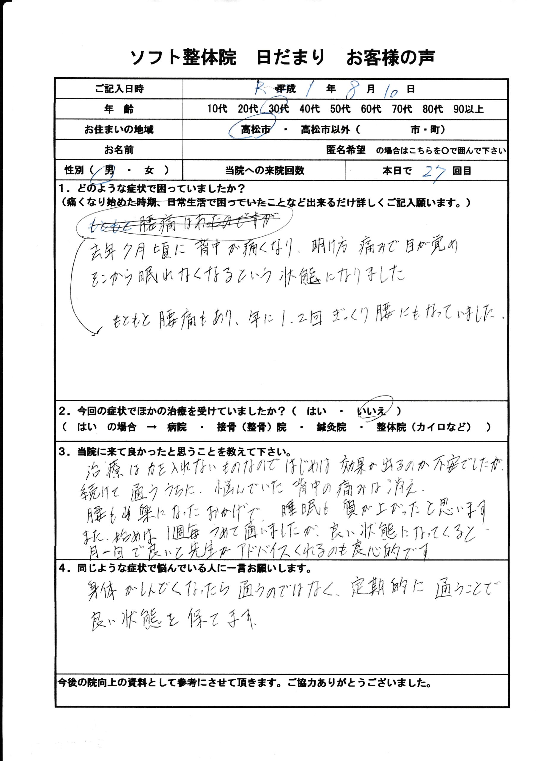 施術は全く痛みもなく、逆にこれで良くなるの?(すみません)という感じでしたが、今ではすっかり良くなり、たまに調子が悪くなっても寝ると治るようになった。前のように元気になれてよかった。