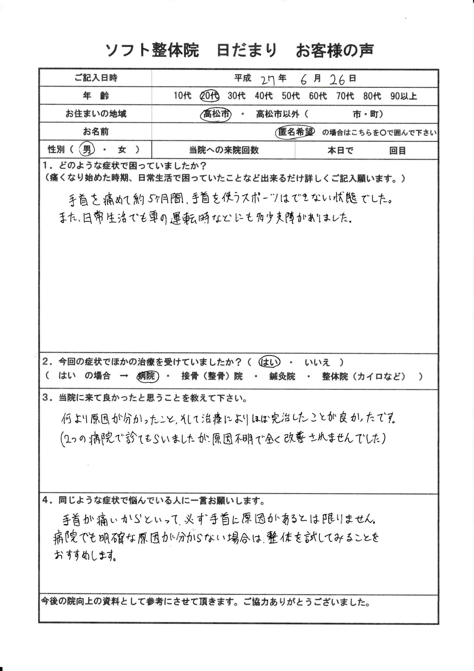 肩こりや首の痛みは長い時間をかけてだいぶ改善していただきましたが、手首の痛みが前回の頭のマッサージ以降、かなり改善されたのは衝撃でした。