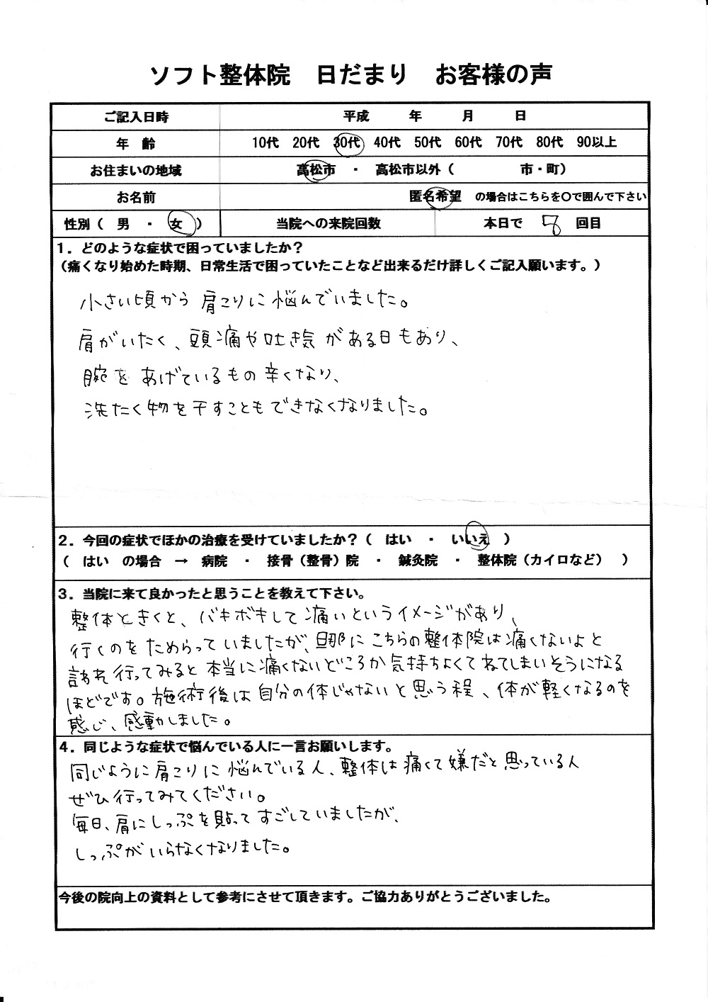 小さい頃から肩こりに悩んでいました。肩がいたく、頭痛や吐き気がある日もあり、腕をあげるのも辛くなり、洗たく物を干すこともできなくなりました。